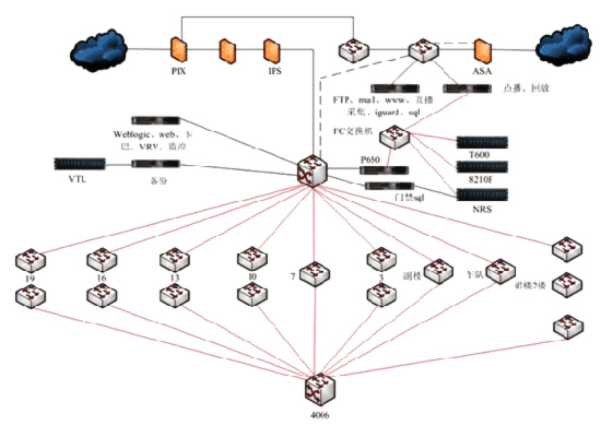 內(nèi)部網(wǎng)絡(luò)包含了悉數(shù)大樓的網(wǎng)絡(luò)構(gòu)造和各種運(yùn)用,詳細(xì)的運(yùn)用有:新聞稿流通體系、物資辦理體系、磁帶辦理體系、門禁花費(fèi)體系、成本核算體系、考勤體系、內(nèi)部網(wǎng)站、DNS解析效勞、VRV桌面辦理體系、卡巴斯基網(wǎng)絡(luò)版殺毒軟件、熊貓硬件防毒墻、上彀行動辦理、網(wǎng)強(qiáng)網(wǎng)管體系、IPS侵略檢查體系、機(jī)房監(jiān)控體系、VTL虛擬帶庫備份體系、NRS疾速康復(fù)體系。